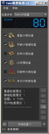 零面积UV面检查: 检查是否有0面积的UV面。它调用了Maya默认的方法计算,不过这个方面太过敏了,常常误判。所以这项检查默认是关的。