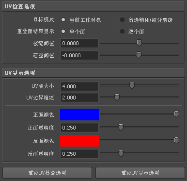 目标模式: 决定检查对象是场景中高亮/选中的物体还是在UV编辑器中选中的UV。